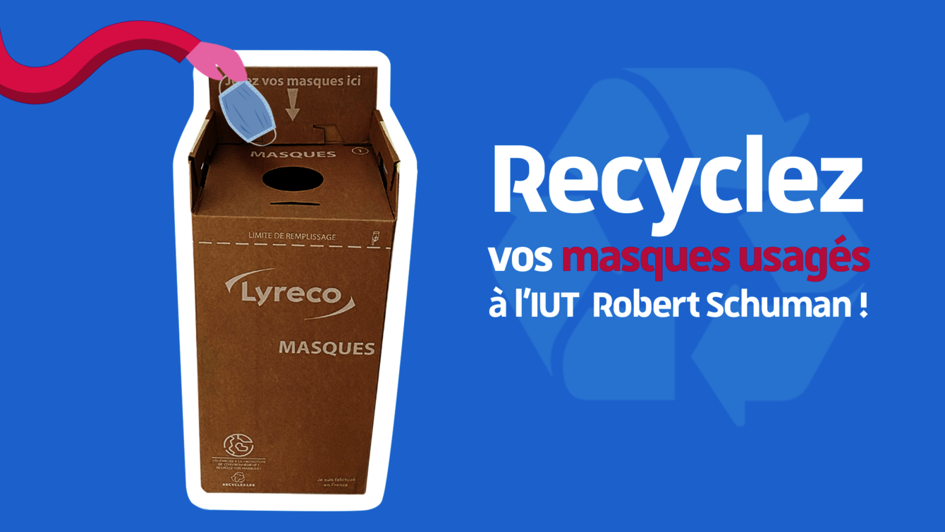 L'explosion récente de la consommation de masques est responsable de la production d’environ 40 000 tonnes de déchets non recyclés en 2020 en France. Face à ce constat, il est évident que le mieux serait de favoriser l'utilisation de masques réutilisables. Néanmoins, nous sommes nombreux à avoir recours aux masques chirurgicaux. C'est pourquoi l'IUT Robert Schuman souhaite à son échelle, encourager le recyclage des masques non réutilisables usagés.