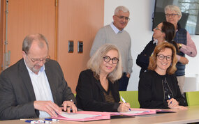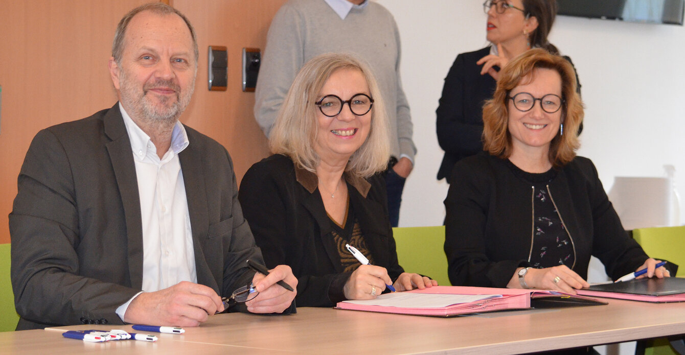 Maha Oberlé, déléguée territoriale au Cnam Grand Est, Malik Bouacida et Eric Rugraff, tous deux enseignants au département TC ont également assisté à cette signature de convention dans la salle Brenet de l'IUT.