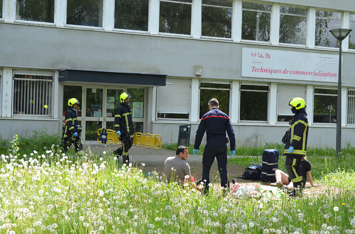 C'est dans le cadre d'un partenariat avec l'école départementale d'incendie et de secours, qu'une simulation d'explosion en conditions réelles a eu lieu à l'IUT Robert Schuman le 11 mai dernier dans une salle de cours du département Techniques de commercialisation, mobilisant une trentaine de sapeurs-pompiers du SDIS 67 et une dizaine de véhicules d'intervention.
