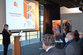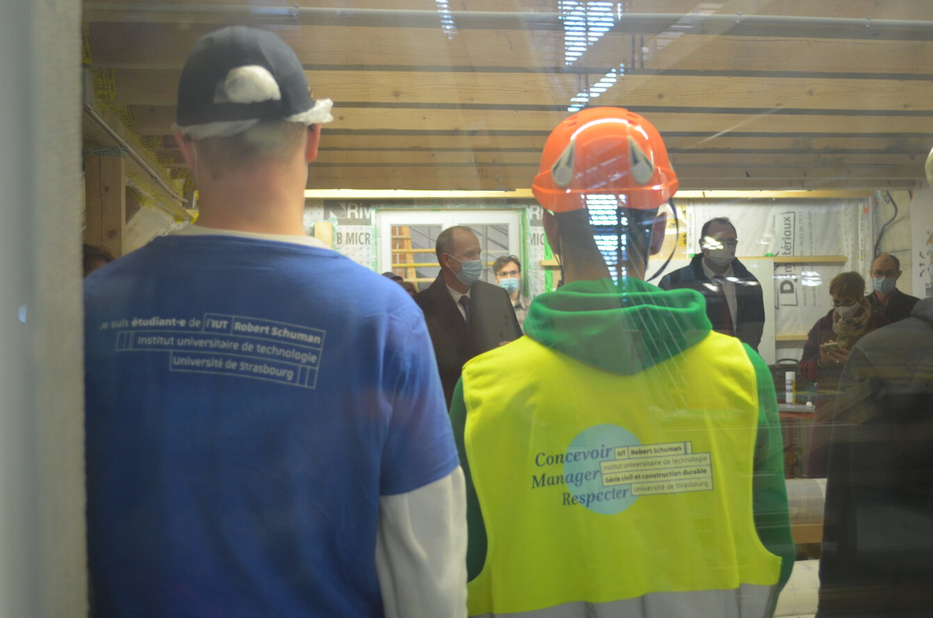 Dans le cadre de la 7e étape du CampusTourGrandEst au Campus des métiers et des qualificatios Éco-construction et efficacité énergétique (CMQ 3E), le 23 novembre 2021, des élèves français·es, allemand·es et suisses issus·e du Lycée Le Corbusier, de l’IUT Robert Schuman et de la Berufsbildende Schule de Neustadt an der Weinstraße, ont présenté le plateau technique Praxibat pour l’isolation et l’étanchéité à l’air. Ils ont pu échanger avec Jean-Marc Huart, recteur de la Région académique Grand Est, Fabienne Blaise, rectrice déléguée pour l'Enseignement supérieur, la recherche et l'innovation et Elisabeth Laporte, rectrice de l'académie de Strasbourg. Ce fut l’occasion pour les recteurs d'observer ce dispositif essentiel, fédérateur et international qui est le CMQ 3E et son nouveau projet Programme d'investissements d'avenir (PIA) « faire du bâtiment l’outil pour la transition climatique ».