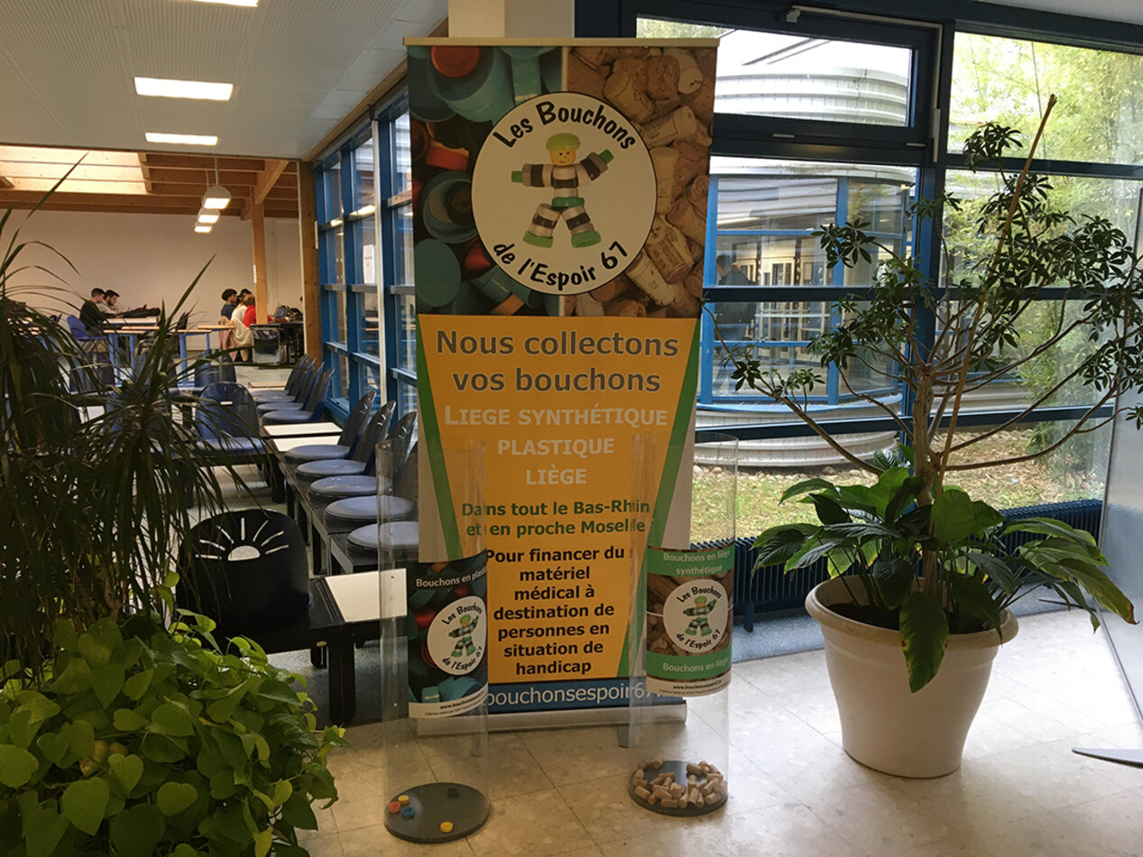 Désormais, vous pouvez également déposer vos bouchons dans les récupérateurs pour l'Association Les Bouchons de l'Espoir 67, à l'Agora dans le bâtiment central de l'IUT.