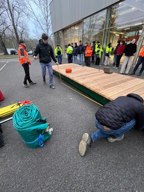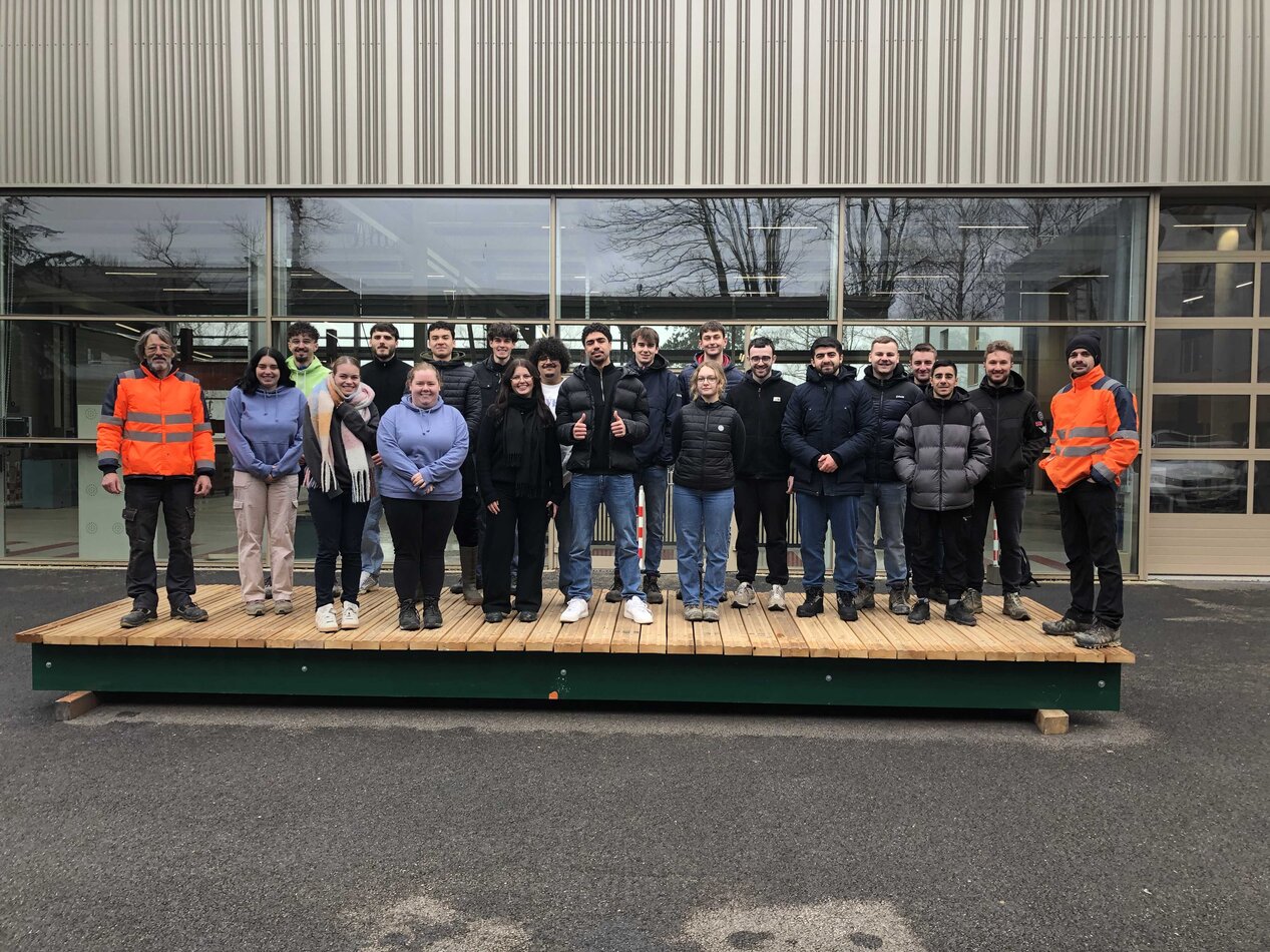 Jeudi 6 février, nos 3e année du Bachelor universitaire de technologie Génie civil construction durable parcours Travaux publics ont participé à des essais de mise en charge d'une passerelle acier/bois de l'Eurométropole de Strasbourg (EMS).