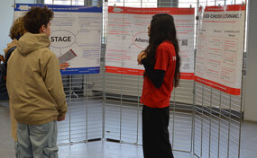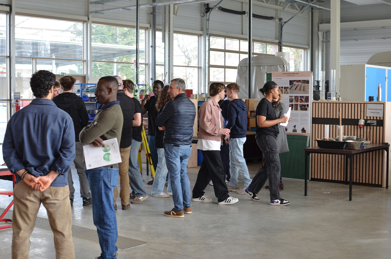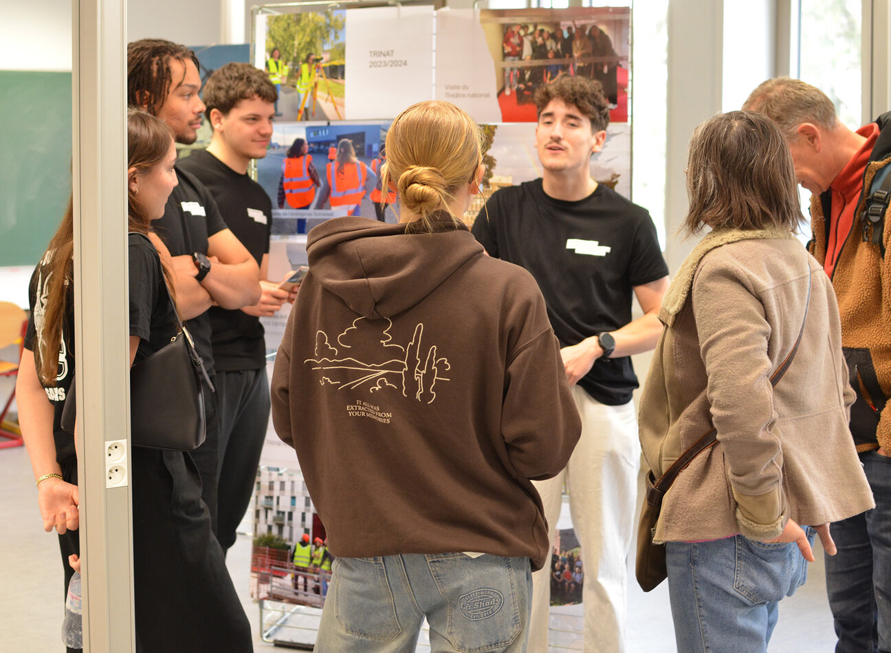 - Dans les couloirs menant aux amphithéâtres : une exposition de photos de la Fête de la rentrée 2025, organisée en octobre pour permettre aux étudiant·es de faire connaissance lors d’épreuves sportives, ludiques, un concours de