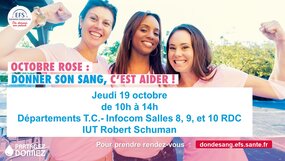 Don du sang à l’IUT Robert Schuman le jeudi 19 octobre de 10 à 14h dans les salles ICTC 8, 9 et 10.