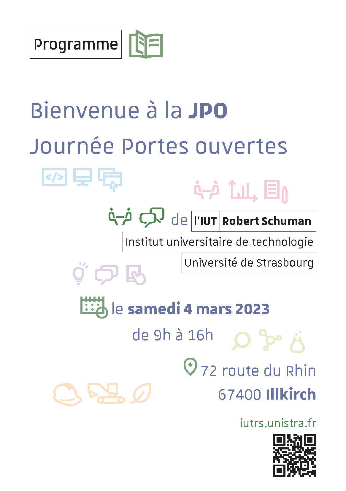 Plus de 350 étudiant·es, enseignant·es et personnels administratifs seront présent·es pour vous renseigner, vous guider, vous faire découvrir l’IUT Robert Schuman et ses formations.