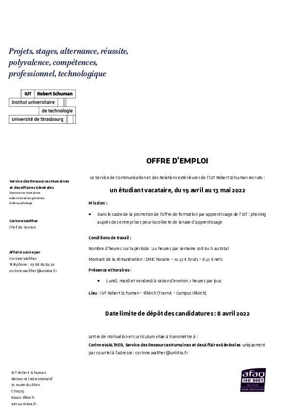 Corinne WALTHER, Service des Ressources Humaines et des Affaires Générales uniquement par courriel.