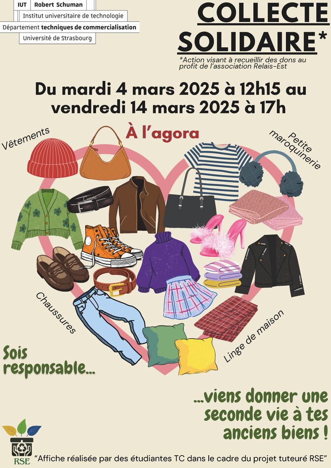Du mardi 4 mars au 14 mars 2025, contribuez à une initiative responsable en déposant vos anciens vêtements, chaussures, linge de maison et petite maroquinerie à l’Agora (entrée du bâtiment principal de l'IUT).