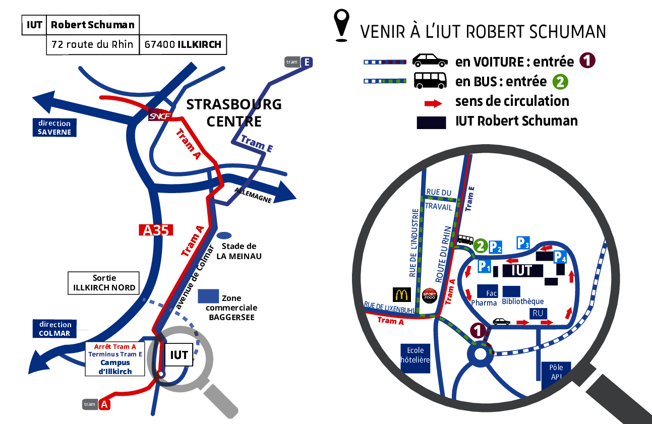 Retrouvez les plans des campus de l'Université de Strasbourg avec notamment l'affichage des dispositifs pour les Personnes à mobilité réduite (PMR). Cliquez sur "Illkirch" pour visualiser le campus de l'IUT Robert Schuman, puis spécifiez vos points d'intérêt sous la carte.