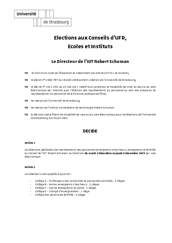L'actuel mandat des représentant·es des personnels enseignants-chercheurs, enseignants et BIATPSS de l'IUT siégeant au Conseil d'Institut arrivera à échéance en décembre 2025.